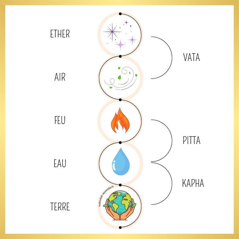 Selon l’Ayurveda, tout être vivant est composé de 5 éléments fondamentaux : l’éther (espace), l'air, le feu, l’eau et la terre.
